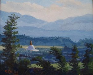 8" x 10" oil on linenThis is the Great Stupa of Boudha viewed from Pullahari Monastery outside Kathmandu in Nepal |